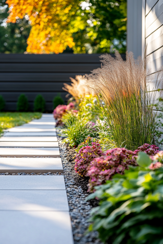 Create an image of a modern, well-maintained backyard with a neat garden bed running alongside a paved walkway. The garden bed features a variety of plants and shrubs, including tall green foliage with bright yellow leaves, small pink flowering plants, and clusters of red and brown ornamental grasses. The plants are densely packed and well-mulched, adding texture and color to the garden. The paved walkway is made of large, light-colored stone slabs, leading towards a set of wide, gray steps that ascend to a patio area. The background features a sleek, dark gray wooden fence that runs along the length of the garden, providing a clean, modern contrast to the vibrant greenery. The scene is bright and sunlit, with the shadows of nearby trees casting dappled light on the path and garden. --ar 2:3