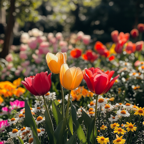 Create a stunning cover photo featuring a picturesque flower garden with a variety of blooming flowers such as roses, tulips, and daisies. The scene should have a natural, vibrant feel, as if captured with an iPhone 14. Include elements like soft, diffused lighting, shallow depth of field, and rich, realistic colors to mimic the high-quality, detailed look of an iPhone 14 photo. The composition should be inviting and visually appealing, perfect for showcasing the beauty of flowers in a fresh, modern way.