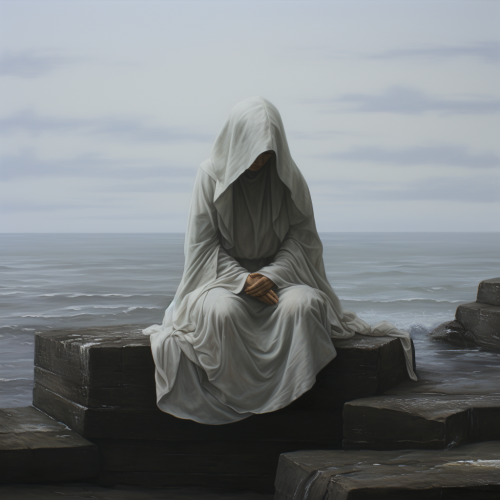It's a foggy and overcast day. on the beach by the sea. There are small puddles on the sand. woman wearing a pleated white dress, photorealistic, pose, cindy sherman:: Craig Mullins, vibrant color, surreal --s 250