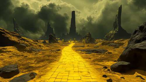 A dark, dystopian landscape filled with jagged yellow deserts and rocky mountains. The skies are thick with storm clouds, casting long shadows over the crumbling remnants of the Wicked Witch of the West’s tech-enhanced fortress. The yellow brick road snakes through the barren wasteland, its glowing path barely visible amid the debris and ruined tech scattered across the ground. Martial gang members, dressed in yellow, patrol the landscape, their advanced weapons ready for battle. The environment is gritty and tense, rendered in a retro 80s anime style, with sharp contrasts between light and dark and a harsh, futuristic edge reflecting the battle for control in the Master of Oz world. --ar 16:9 --v 6.1