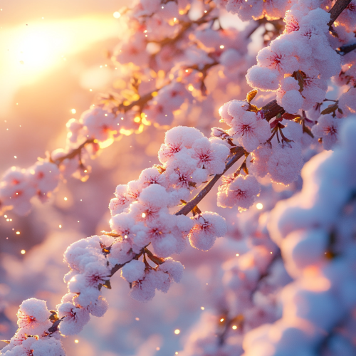 Create a breathtakingly beautiful and serene landscape featuring cherry blossoms gently covered with a soft layer of snow. The scene is set at sunset, with the warm golden light of the setting sun casting a soft, ethereal glow over the snow-covered cherry blossoms. The delicate pink petals of the blossoms peek out from beneath the light dusting of snow, creating a stunning contrast between the warmth of the flowers and the coolness of the snow. The sky is a gradient of soft pink, orange, and lavender hues, with the light reflecting gently off the snowy blossoms and casting long, peaceful shadows. The overall atmosphere should feel tranquil, magical, and romantic, as the serene beauty of the snowy cherry blossoms and the warm sunset light blend harmoniously to create an idyllic and peaceful scene