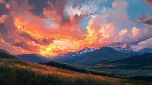 An oil painting of an eagle soaring over the mountains, with a sunset in the background, a misty river below with trees and branches, painted in the style of Bob Ross. The brushstrokes are visible, and the colors are vivid, with a detailed texture on the feathers --s 250 --v 6.0