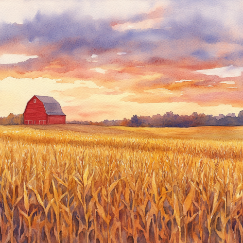 A watercolor painting of Indiana’s vast, golden cornfields at sunset, with a red barn standing proudly in the distance. The sky is painted in soft oranges, pinks, and purples, and the light reflects off the corn, creating a warm, inviting scene that captures the heartland of Indiana, representing its agricultural heritage and rural beauty. Art Style: Watercolor with Warm, Pastoral Tones and Expansive Landscape