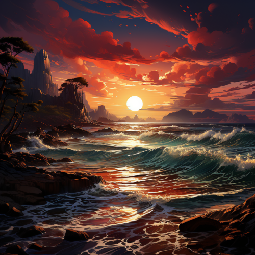Create a highly realistic, 8K resolution image of a stunning sunset over a pristine beach with white sand. The waves gently roll onto the shore, their movement calm and rhythmic. The sky is filled with intense yellow hues as the sun sets, transitioning into deep blues and purples as stars begin to twinkle. The atmosphere feels like an invitation to reflect, with a sense of philosophy and tranquility in the air. Surrounding the beach, lush green nature flourishes, adding a touch of serenity and vibrancy to the scene. The overall feeling is one of awe, beauty, and contemplation, as the world seems to pause in this perfect moment --ar 7:4 --s 250 --v 6.0