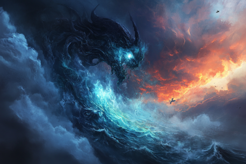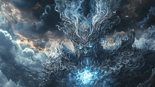 blue Fire in the sky behind a massive ancient demonic entity, no people, Dark hypnosis of the mind, horror concept art in the style of dark fantasy, in the style of eliran kantor, detailed background elements, a colorful palette with silver, light grey, light blue hues, intricate patterns on a black sky and swirling clouds, eldrich style abyssal landscape, no people or figures, a giant wave engulfing everything. In a highly realistic illustration style, high resolution, high detail, and high quality --v 6.1 --ar 3:2