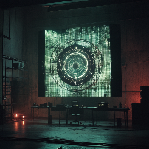 dark fantasy sci fi movie, in room lit by tungsten lights a massive quantum super computer is in a cold room, on the wall behind it a giant minimalist Oroboros design 70mm film