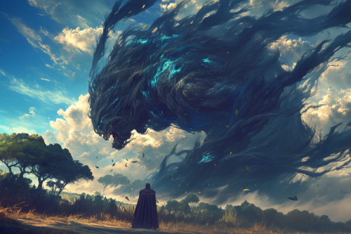 a giant monster made of wind, leaves, and trees facing a tornado + horror + art style of Capullo, Brom, Whelan, aly fell rutkowski, art germ, rossdraws, and franzzeta + art station + ultra detailed + hyper realistic + 8k --ar 3:2 --niji 6