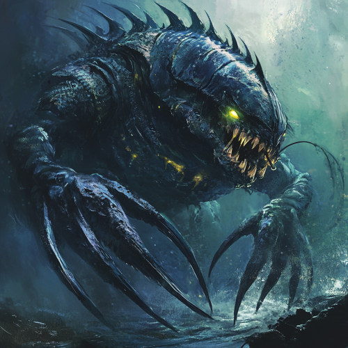 Design a new sea monster with a massive, segmented body covered in tough, dark blue exoskeleton plates. It has a head with multiple rows of sharp, needle-like teeth and bioluminescent, greenish-yellow eyes. Its limbs are long, spiked appendages that resemble giant claws, and it has a series of retractable, barbed stingers along its back. The sea monster is captured by a large fishing boat, its powerful tail thrashing against the deck and its claws ensnared in heavy-duty nets. The boat’s crew looks on in a mix of terror and awe as the monster's bioluminescent eyes glare menacingly. --v 6.1