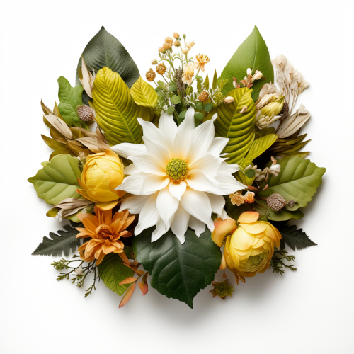 object photography, A beautiful crown made of leaves, decorated with a large flower in the center, super realistic texture, macro lens, white background, --ar 1:1