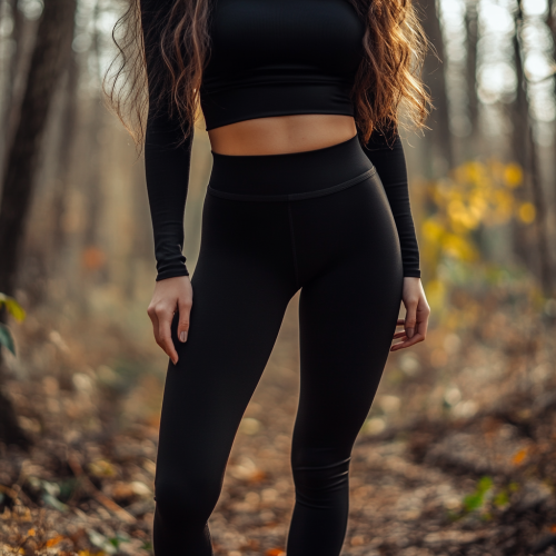 photo, women, model, photo shoot, thermowear, Women's black plain cotton leggings, hyper realistic, semi-blurred background, mockup, Full HD, high resolution, shot with Canon EOS R5 F1.2 ISO100 80mm