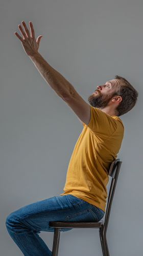 side back view of an impresed man, with a wow expression on his face, with short hair and a short beard, wearing blue jeans and a yellow t-shirt, extended arm as if he is reaching out for an off camera chair, and his hand's palm facing up, gray plain background, hyper-realistic photography --ar 9:16