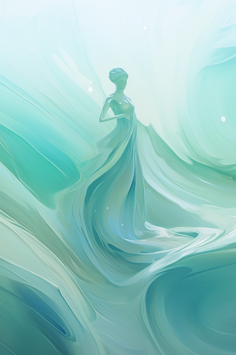 surreal, a calm wavy ocean, a transparent and translucent figure that can be seen through the waves like a stain, vivid pastel turquoise green shade colors, --ar 2:3