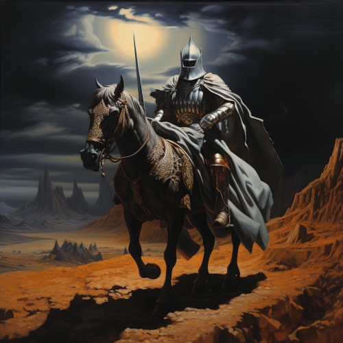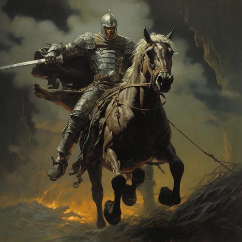 Painting of a knight, the knight is carrying a barbarian warrior in his, the two are flying, 1970's surrealist dark fantasy art style, book cover art, realist: lifelike accuracy, volumetric lighting, --style raw --ar 1:1