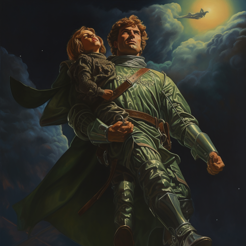 Painting of a knight carrying a barbarian in his arms while flying, 1970's surrealist dark fantasy art style, book cover art, realist: lifelike accuracy, volumetric lighting, --style raw --ar 1:1