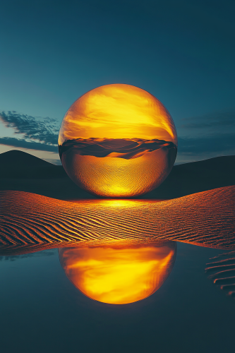photo background, Minimal zen aesthetic wallpaper, A featuring desert and behide is a Abstract surreal cosmic scene background with low rocky mountains and sunset. sunset shining from above, sculpture and large white sun. In the foreground, there is an oval platform, The oval platform is yellow crystal. creating a surreal and ethereal atmosphere. Large panoramic view can see the Sky behind, the sky is cloudless. The overall look is sad and contrasting between the sky and the sand desert, in yellow gold and black tones. everything Material is transparent glass, Metallic mirror pillars, geometric mirror, deification, goddess , luxury theme, yellow ones, dark theme, a sense of luxury, 3D render, reality, Immerse yourself in a world of creativity, --ar 2:3