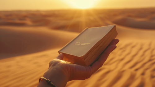 A close-up photograph of a hand with a single book delicately balanced on the tip of the index finger, surreal lighting casting elongated shadows. Background of a vast, ethereal desert landscape with a warm golden sunset. Dunes blurred in the distance, soft gradients of light across the sky, cinematic tones, ethereal atmosphere, realistic texture, hd quality, natural look --ar 16:9 --v 6.0