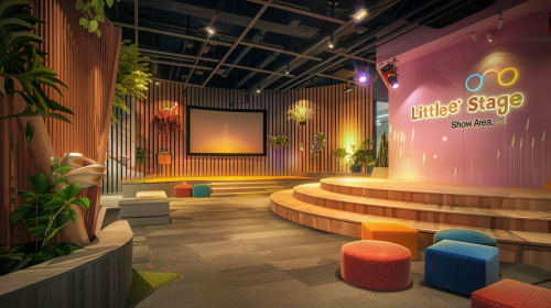 The "Little Stage Show Area," a creative platform for children's performances, featuring a stage, projector, and modular seating for family gatherings. The space is transformable into a cinema, providing a multifunctional entertainment zone. Created Using: flexible design, performance-enhancing lighting, audience-friendly layout, adaptable seating, hd quality, natural look --ar 16:9 --v 6.0