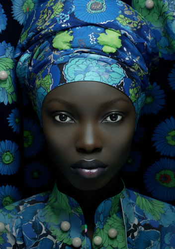 a girl in a blue and green pattern, in the style of color photography pioneer, contemporary african art, eye-catching composition, opulent fabrics, onii kei, wrapped, emotive faces --ar 70:100