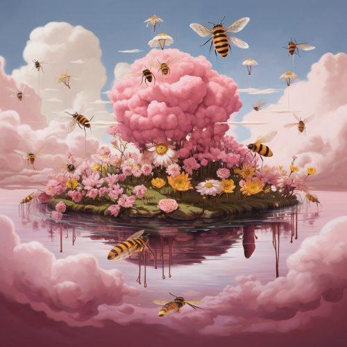 a surreal illustration of a floating island of bees, New Yorker magazine art style, elegant, vivid colours, surreal, flying fish, pink clouds, elegant, magic animals