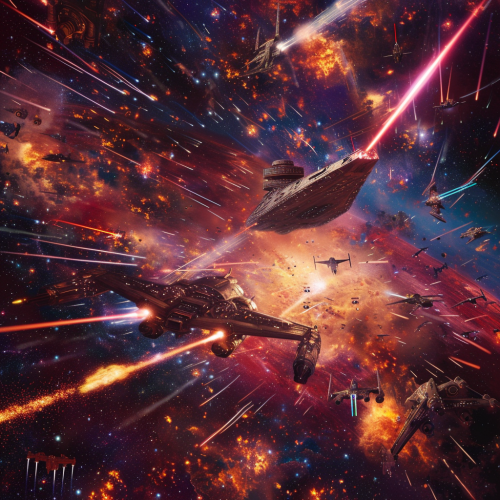 A galactic battlefield, with space warships and fighters engaged in intense combat among the stars, explosions and lasers ripping through the night sky, creating a grand and spectacular interstellar battle scene --v 6.0