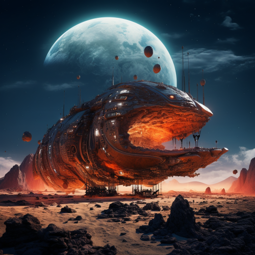 photo background A space fantasy Beautiful, A featuring panorama space and panoramic view of Abstract surreal cosmic. moonrise shining from above, sculpture and large moon. creating a surreal and ethereal atmosphere. Large panoramic view can see the nightSky behind, The stars in the cloudless night sky. in red and dark red tones, univers, surreal cosmic, scene , material Metallic golden, 3D render, realistic ultra-details --ar 2:3 --v 6.1