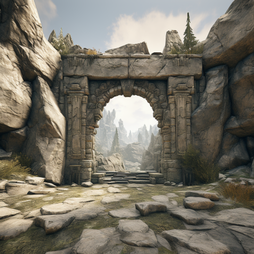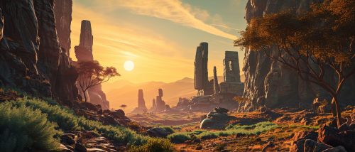 Surreal Galaxy Sky with Ancient Ruins and Stone Hands