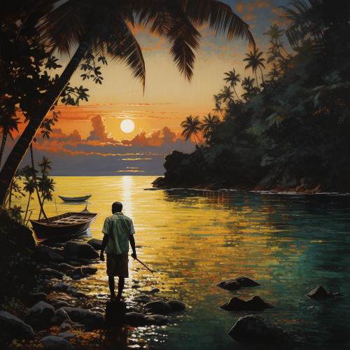 "A surreal vision of Jamaica where the island is suspended in the sky, its beaches forming waterfalls that pour into the clouds below. The sea merges with the sky, and the palm trees grow in impossible directions. Reggae music flows through the air like colorful ribbons, wrapping around the landscape. The Blue Mountains rise impossibly high, reaching for the stars, while the sun is both setting and rising at the same time. The scene captures the dreamlike, transcendent beauty of Jamaica, merging culture and nature into one surreal experience." Art Style: Surrealist with a blend of fantastical landscapes and cultural motifs