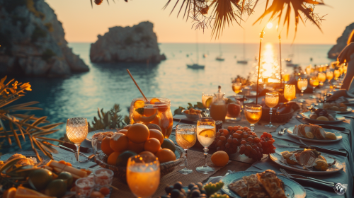 a party on a Mediterranean island beach in the style of mamma mia with sangria cocktails and dancing --ar 16:9 --v 6.0 --s 250