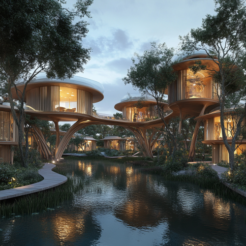 a futuristic community inspired by the resilience and interconnectedness of a mangrove root system. The elevated structures and interlocking pathways mimic mangrove roots, creating an organic, nature-integrated environment over water.