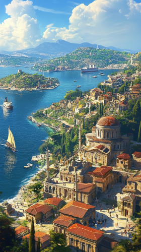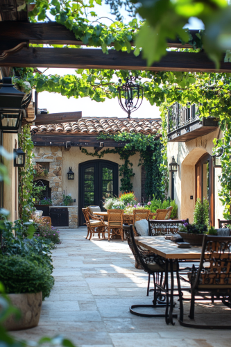 Visualize an outdoor terrace that epitomizes Mediterranean living with lush plantings, stone pathways, and a pergola covered in grapevines. The furniture should be wrought iron or rustic wood, featuring comfortable cushions covered in weather-resistant fabric in earthy tones or vibrant Mediterranean blues. Include elements like a stone fountain or ceramic tile tabletops, enhancing the outdoor experience. This inviting outdoor space should be presented in full view, showcasing how it seamlessly integrates with the natural landscape. The image should encourage viewers to click for more ideas on Mediterranean terrace and patio designs. Camera: DSLR - Canon EOS 5D Mark IV. Lens: Canon EF 24-70mm f/2.8L II USM. Composition: Wide shot, room-centered, horizontal orientation, balance between furniture and space. Film: Digital, high resolution, color profile sRGB. Camera settings: ISO 400, f/2.8, 1/60 sec. --ar 2:3 --v 6.1 --s 250