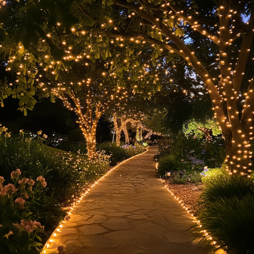 A night garden illuminated by soft, warm lights, with glowing pathways and trees draped in fairy lights, creating a magical and inviting atmosphere. Taken with an iphone 15 pro