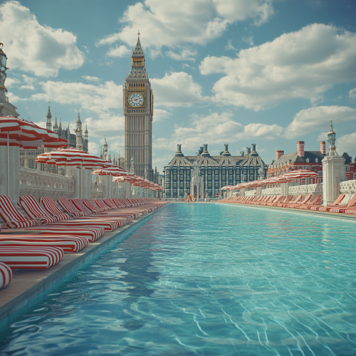 Detailed, ultra high-quality image of an olympic sized infinity style swimming pool, located beneath Big Ben in London, UK. There are red and white striped sun loungers and parasols around the pool. cinematic shoot, ultrareal, --style raw --ar 1:1 --s 400