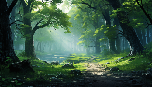 Lush green forest in a bright mist, uplifting and serene atmosphere. Vibrant, healthy trees, clear pathways, fresh air. More clarity. Technique: Semi-realistic, --aspect 7:4