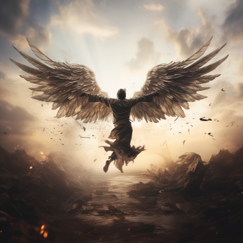 far away shot of a burning angel falling upside down to the ground, clear blue sky background, oil painting style, --v 6.0