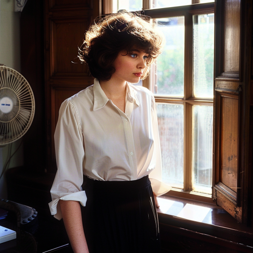 A hot day in England 1980. A photo of a beautiful brunette model with hair in a curly bob with bangs, curves, blue eyes, , 30's, , wearing a plain white long sleeved button blouse, black pencil skirt, shoes, standing in a home office by a window with a fan on the sill, , looking down , smiling a little. backlight, realistic. --s 50 --v 6.0 --style raw