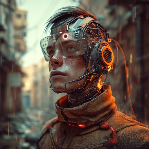 a English man in the year 2300, blending traditional and futuristic elements, realistic portrayal, cultural details, advanced technology in the background --v 6.0 --s 50