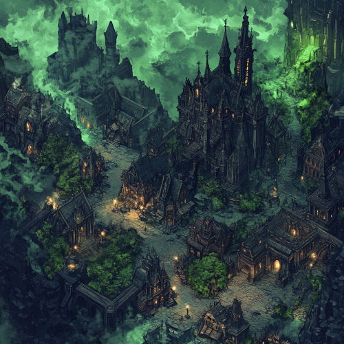 A Gothic village viewed from above, nestled at the base of a towering, dark mountain with ominous green-lit clouds swirling around the peaks. The village is surrounded by an invisible magical sphere, protecting it from unseen forces. The streets are lined with dark, intricate architecture, full of shadowy bridges, towering statues, and ornate monuments. In the village center, a vast Gothic plaza with cobblestone pathways and lantern-lit street corners creates a haunting beauty. Overlooking everything, a colossal Gothic castle casts a vast shadow across the village, with tall spires reaching into the misty clouds.