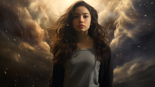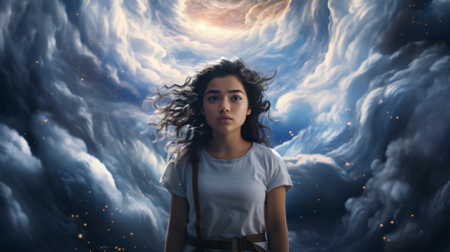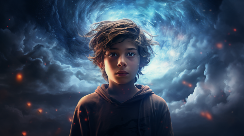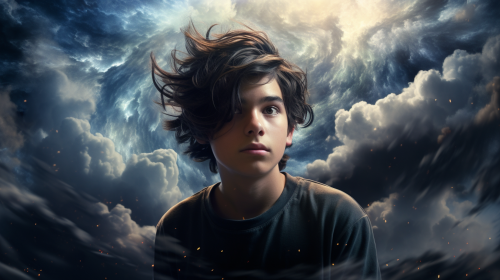 dark-haired teenage boy staring at camera, galaxies and clouds swirling around, surreal scene, dreamlike, genesis, paradise, photorealistic, --ar 16:9 --v 5.2