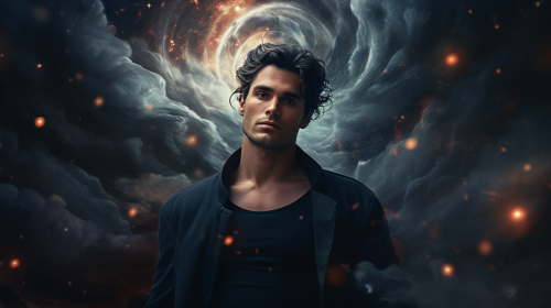 dark-haired man staring at camera, galaxies and clouds swirling around, falling stars, planets, surreal, genesis, paradise, photorealistic, --ar 16:9 --v 5.2
