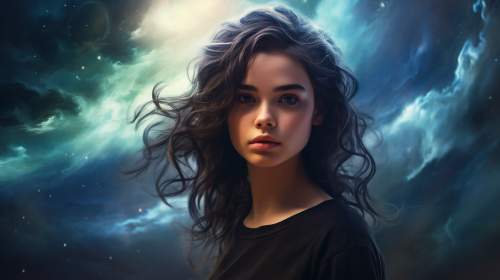 dark-haired boy staring at camera, mountain valley, creation of universe, surreal scene, swirling clouds, twinkling stars, --ar 16:9 --v 5.2