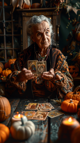 detailed photo of old woman tarologist, looking straight at you, centric symmetrical composition, sitting at the table holding tarot cards, autumn, half body, lots of pumpkins around, halloween, candles, Fujifilm camera, 8k, VFX --ar 9:16 --v 6.0