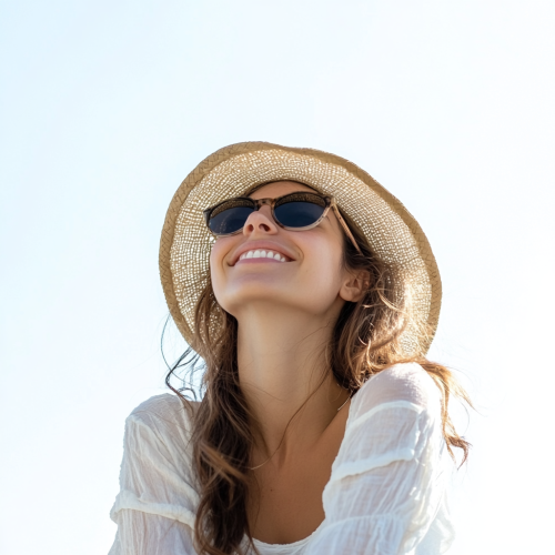 Italian style tourist WOMAN, with sunglasses, smiling, likes to explore and live Gastronomic Tourism experiences, which are part of different social routines from hers a view of her from below looking at the horizon, in high definition, white background