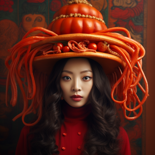 chic Eurasian woman wearing noodle hat, surrealist, sriracha