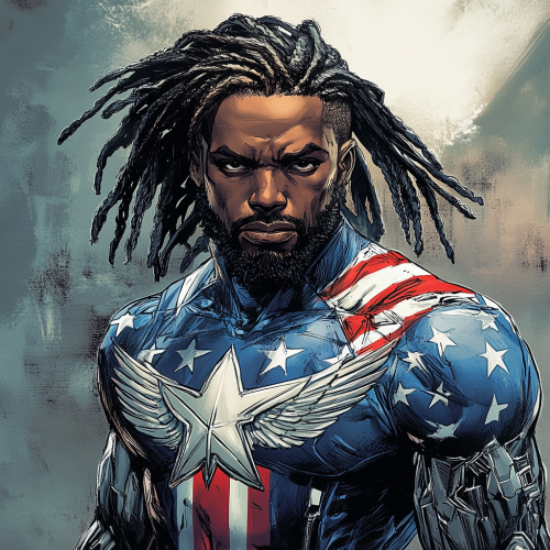 a black man with dreads in 2 pigtails wearing a patriotic suit that’s silver and blue with a phoenix symbol for redemption on his chest. This is character for a comic book
