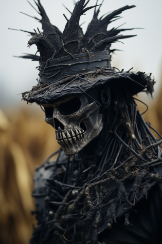surrealistic, horror movie style, profile view, corn field, straw man, voodoo, made of sticks, crows, evil, exorsism, gothic, photorealistic, Leica M10-R 8k Leica 35mm lens, Tilt Blur, Shutter Speed 1/ 1000, F/ 5.6, Super - Resolution, --ar 97:145 --s 250 --v 5.2