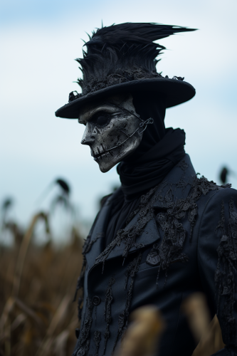 surrealistic, side view, profile view, scarecrow, field, crows, evil, exorsism, gothic, photorealistic, Leica M10-R 8k Leica 35mm lens, Tilt Blur, Shutter Speed 1/ 1000, F/ 5.6, Super - Resolution, --ar 97:145 --s 250 --v 5.2