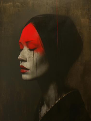 dark horror beksinski style, white ivory skin, red geisha makeup, Zdzisław Beksiński painting a portrait of an occult wonderfull android geisha, ivory skin with red makeup, minimalist clothes, artificial intelligence, dark ambient, mix biotechnology and high tech part, caspar david friedrich, Blame, --ar 3:4 --v 6.0