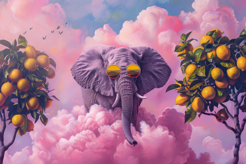an elephant wearing sunglasses sits on a pink cloud, trees with lemons, fairy tale, fantasy, magical, surreal, high resolution, oil painting, bright colors, --ar 3:2 --v 6.0
