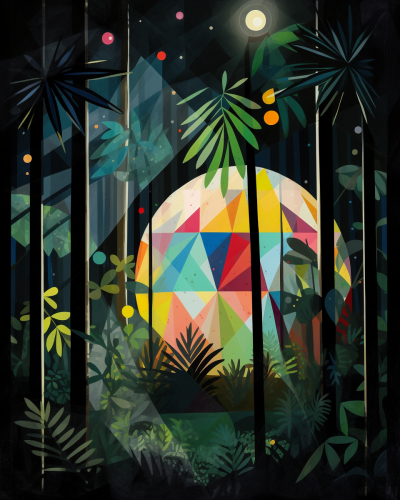 One minimal poster of giant glass prism and disco ball in the jungle at night giving off beautiful rays of color in the style of Gary Bunt --ar 4:5 --v 5.0