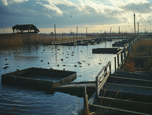 A fish farm scene with overfishing and polluted waters, depicting the tragedy of the commons. the style of 35mm film --style raw --ar 12:9 --v 6.0